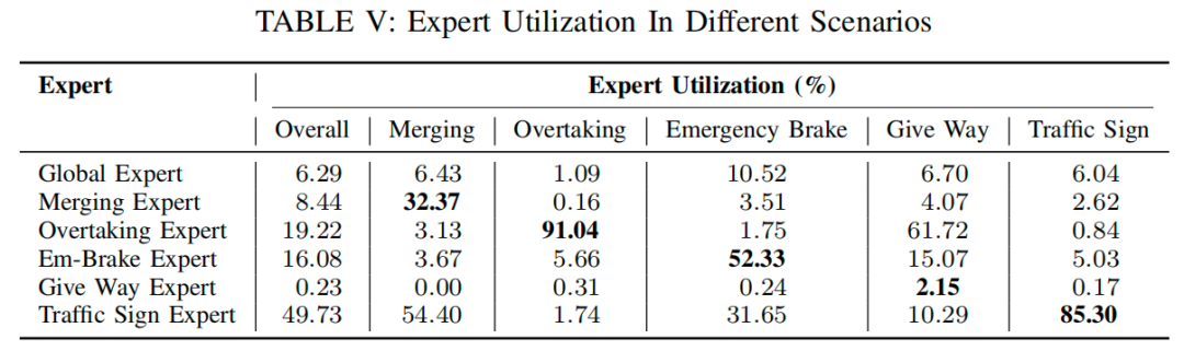 专家利用率。 如表V所示,“总体”一栏显示全局专家的利用率为6.29%。这表明GEMINUS在大多数情况下优先路由至场景自适应专家,以利用它们的场景特异性能力。全局专家主要在高度模糊的场景中被调用,以确保鲁棒和稳定的性能。此外,将表V中“全局专家”一行的数据与表IV中的路由器准确率进行对比分析,可以观察到一个清晰的模态:在路由器预测准确率较高的场景(如超车1.09%和交通标志6.04%)中,全局专家的利用率最小;相反,在三个路由器预测准确率较低的场景中,模型表现出更高的全局专家利用率,这有助于维持鲁棒性和稳定性能。