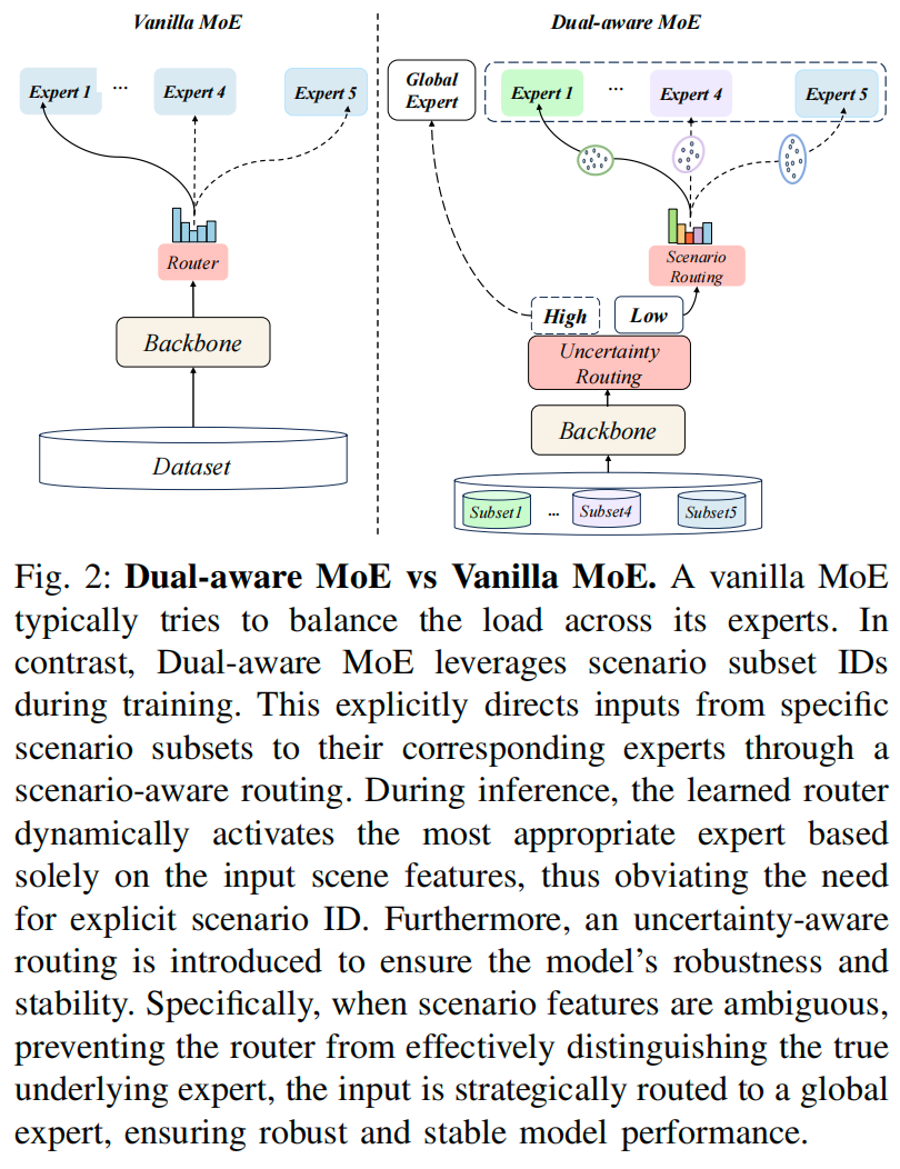 为端到端自动驾驶引入了一种双感知路由器,其独特设计兼具场景感知(scenario-awareness)以识别不同场景间的差异,以及不确定性感知(uncertainty-awareness)以建模路由不确定性。
