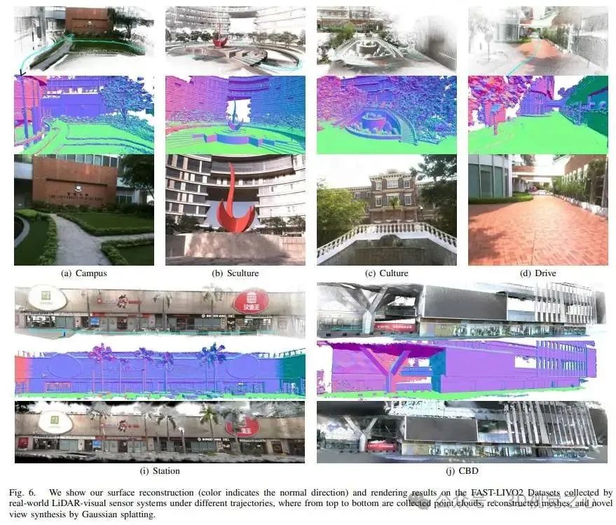 三维表面重建和真实感渲染在增强现实、具身人工智能等广泛应用中至关重要。随着摄像头的普及以及低成本激光雷达传感器在机器人上的应用,丰富的多模态数据采集变得可行。激光雷达-视觉SLAM技术已被广泛应用于三维重建任务。然而,这些方法通常仅输出离散的彩色原始点云,缺乏完整的表面结构,也不具备依赖视角变化的新视图合成能力。在实际的数字孪生应用中,高质量、封闭的表面重建和真实感渲染是关键。
