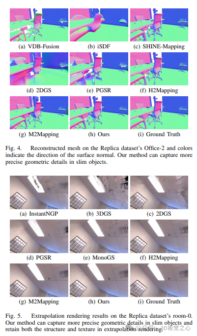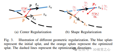 神经辐射场(NeRF)因其生成高保真渲染的能力而受到关注。但其计算开销大,难以满足实时应用的需求。三维高斯喷溅(3DGS)作为NeRF的有力替代方案,以显式椭球高斯原语实现高效的光照真实渲染。与NeRF依赖繁重的体积渲染不同,3DGS采用光栅化的方式进行渲染。然而,这些原语的碎片化结构破坏了结构连续性,且往往与真实几何对齐不准确。这种不一致性阻碍了几何一致的渲染,尤其在机器人应用中,自由视角的轨迹往往会导致观测数据不足。此外,在仅依赖图像监督、摄像头姿态不完美的情况下,3DGS容易过拟合光度信息,产生悬浮伪影。这促使我们在3DGS框架中引入几何正则化。