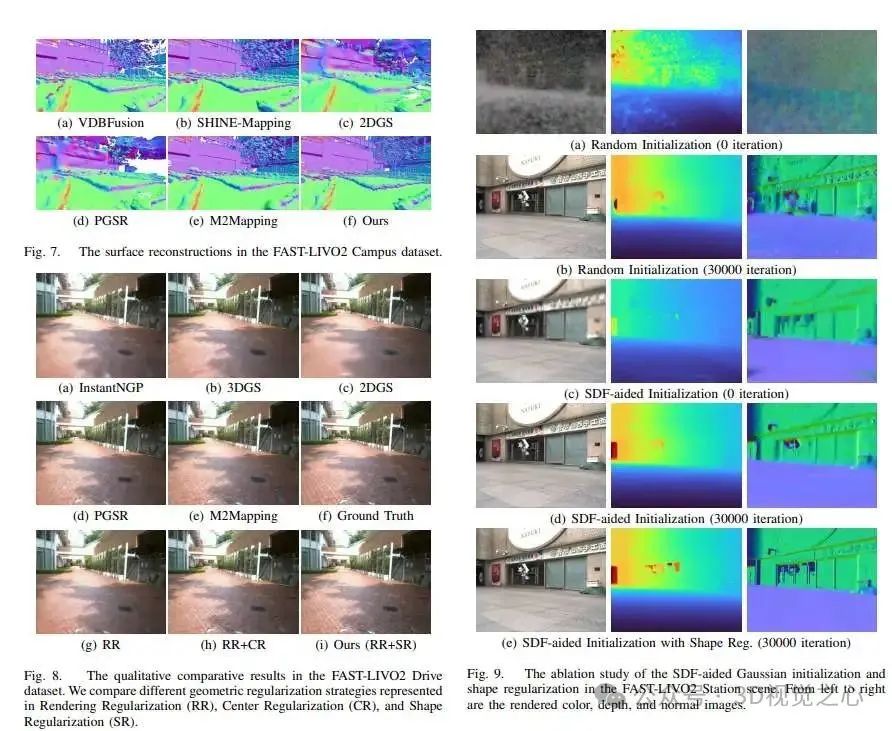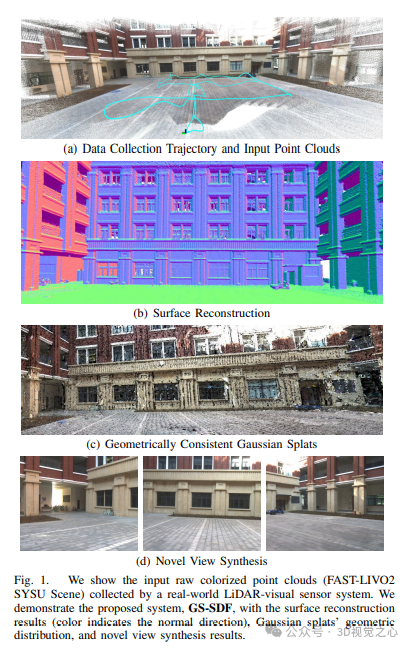 为了解决上述问题,本文介绍将二维高斯喷溅与神经有符号距离场结合于激光雷达-视觉系统中。我们的目标是在任意轨迹下,利用配准图像与低成本激光雷达数据,同时重建场景的外观与表面结构。我们强调高斯初始化在获得良好结构中的关键作用。我们结合NSDF与高斯喷溅,以利用结构和光度线索,实现高精度的表面重建与几何一致的渲染,如图1所示。