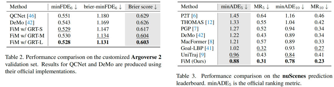 nuScenes。我们还在nuScenes数据集上评估了FiM,结果如表3所示。我们的模型在此预测基准上表现出顶级性能,超越了排行榜上所有当前的条目,进一步验证了我们所提出框架在应对复杂运动预测挑战方面的鲁棒性和先进能力。