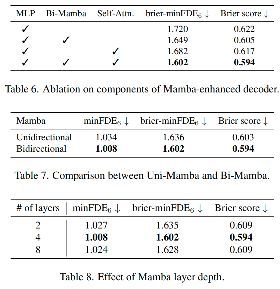 Mamba解码器组件的效果(Effects of Components in Mamba-Based Decoder)。我们对各种解码器组件进行了消融分析,以检验Mamba-like结构相对于传统方法的优势。此分析有助于确定该设计是否为轨迹解码带来了有意义的特征提取增强,还是构成了过度设计。表6的结果突显了这一设计的优势。与使用MLP作为回归和分类头相比,Bi-Mamba架构和不同模态间的自注意力机制都显著提升了预测性能和置信度。此外,我们研究了为分类提出的双模态token的效果,并将其与一个使用单个模态token来聚合轨迹查询特征的单向Mamba模型进行比较。如表7所示,Bi-Mamba模型表现更优,得益于其前向-后向扫描机制,该机制能有效地将轨迹特征融合到两个分类(CLS)token中,验证了该设计的好处。我们还考察了不同Mamba层数深度的影响,如表8所示。结果表明,更深的层数可能会引入不必要的计算开销,并且由于过拟合也可能导致性能下降,这凸显了选择最优层数配置以实现强大性能的重要性。
