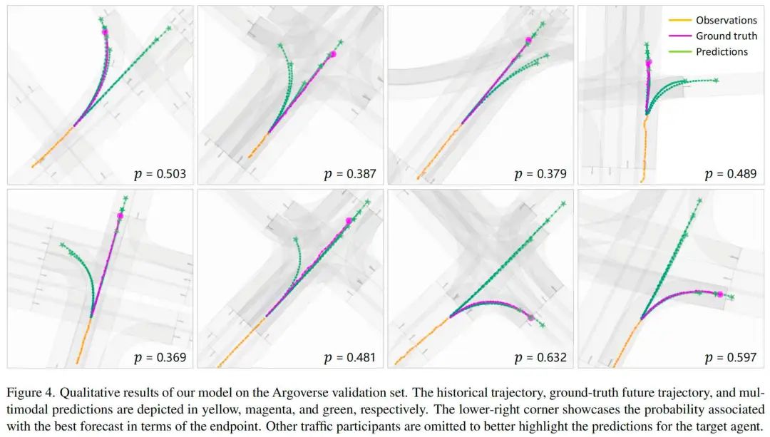 我们在Argoverse验证集的多种交通场景中展示了我们所提出方法的可视化结果,如图4所示。这些定性结果强调了我们的模型在各种条件下(包括复杂路口和长距离预测场景)生成准确、可行且多模态的未来轨迹的强大能力,这些轨迹与场景布局保持了良好的对齐。
