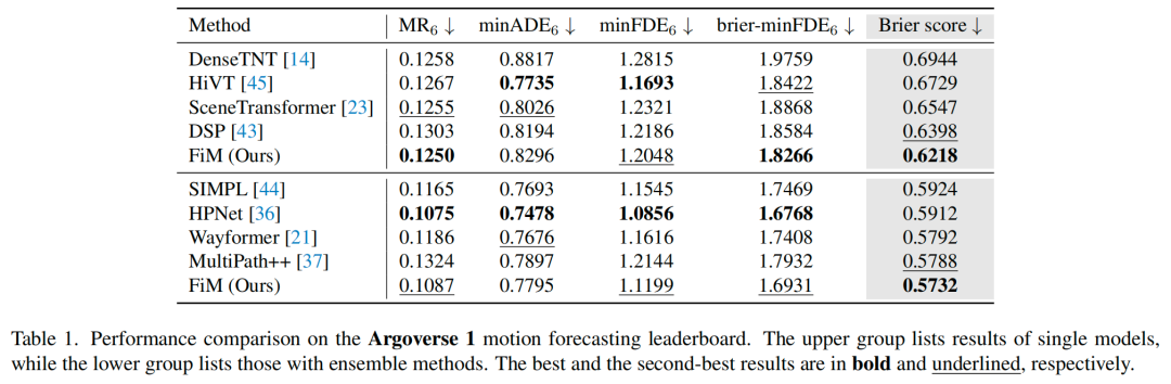 Argoverse 1。表1展示了在Argoverse 1测试集上的定量结果。我们将我们的FiM与在此具有挑战性的基准上评估的几个代表性已发表方法进行了比较。根据单模型结果(上半部分),FiM相较于强大的基线方法(包括直接轨迹预测模型如HiVT和SceneTransformer,以及基于目标的模型如DSP和DenseTNT)都取得了极具竞争力的性能。FiM在Brier分数、brier-minFDE6和MR6方面表现尤为出色,突显了其强大的预测能力。