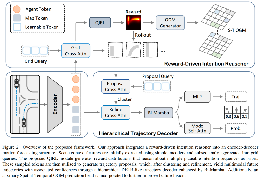 如图2所示,我们的运动预测方法采用了一种编码器-解码器结构,该结构包含一个以查询为中心的场景上下文编码器、一个由Mamba增强的分层轨迹解码器,以及一个奖励驱动的意图推理器。