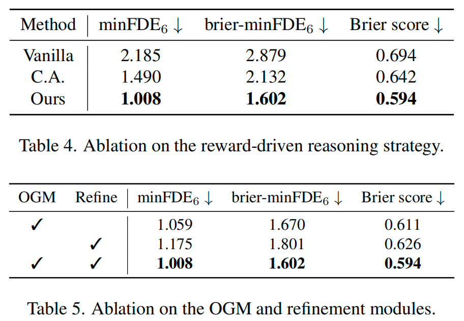 OGM与优化模块的效果(Effects of the OGM & Refinement)。我们进一步通过分别消融辅助的时空占用网格图(S-T OGM)模块和优化模块来评估其影响,如表5所示。这两个模块都对最终性能做出了显著贡献。特别是,OGM带来的性能提升证实了建模未来交互能够增强预测质量,突显了意图推理对于改进轨迹预测的重要性。