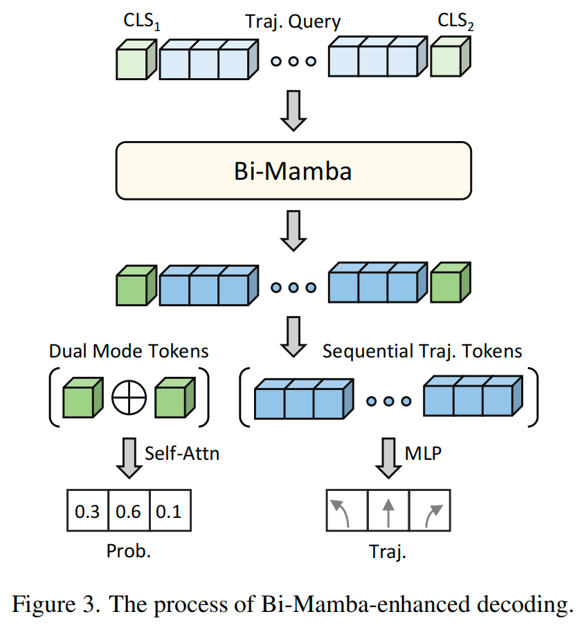 为了更好地利用Bi-Mamba结构的双向能力,我们设计了一个可学习的双模态查询 ,其中包含两个分类(CLS)token。如图3所示,这两个token(CLS1和CLS2)分别被附加在轨迹查询 的前面和后面。这两个token分别聚合了后向和前向特征,与使用单个分类token的单向Mamba相比,实现了更全面的融合,这一点在我们的消融实验结果中得到了验证(见表7)。在Bi-Mamba处理之后,两个CLS token通过逐元素相加进行特征融合。然后,一个模态自注意力模块使不同模态之间能够交互,进一步增强了预测的多模态性。最后,模态token通过softmax函数进行分类以生成概率,而序列轨迹token则通过回归头解码以生成轨迹偏移量。