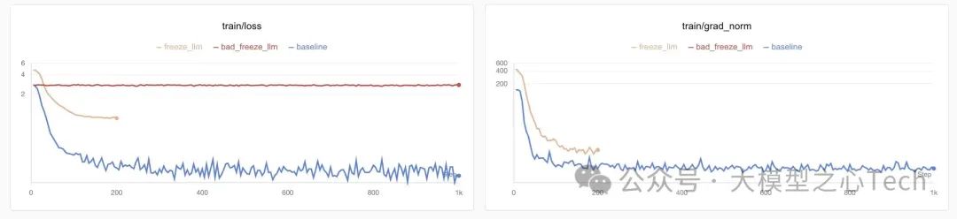 此外,模型通过分析1k步之后的训练损失、平均梯度范数(Grad Norm)变化。此时训练任务已过半,且学习率开始快速衰减。如下图,可以看到学习率快速衰减的情况下模型损失并没有明显的进一步下降,这说明模型已经实现了充分训练。