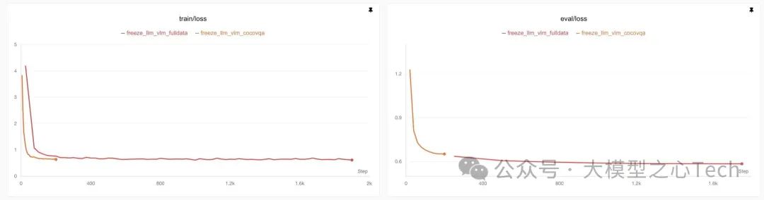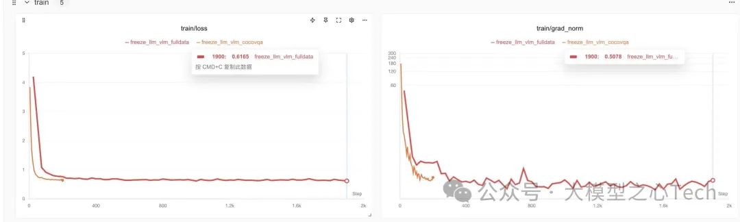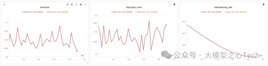 在前期进行方案验证阶段笔者采用的是cocoqa数据集,并且进行200steps的微调训练。在确定方案可行后笔者计划使用完整数据集进行微调训练,然而考虑到训练数据量仅仅只有整个模型的12M,因此笔者按参数量与训练Token的比值为1:10采样数据集,即总共从数据集中采样出60K条数据用于实际训练(文本长度按照2k计算,实际上有padding部分因此实际参与token数小于120M)。笔者认为参与训练的数量是足以令模型收敛的,后续实验也证明了模型确实能达到我们所期望的效果。