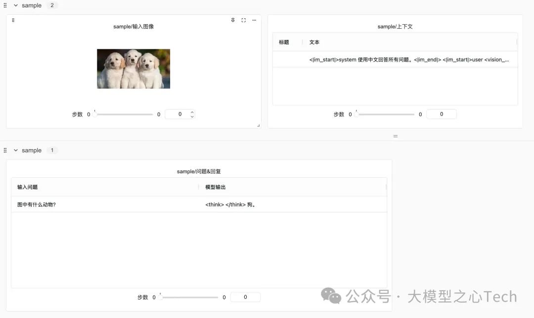 当时看到模型对着三只狗的图片回答“兔子”时笔者一时认为炼丹失败了,当然如果实际炼丹失败后模型是不会输出动物类型的,而是输出一些乱码或者告诉用户并没有看到图片。识别错误的原因实际上是由于训练步数过少导致的。后续加大训练步数与数据量后模型能正常识别出狗狗并且能准确的说出有三只狗。