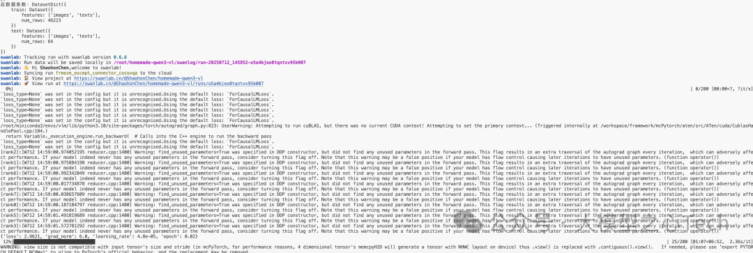 注意,本项目使用SwanLab进行训练日志记录与分析,如果未登陆SwanLab需要使用swanlab login进行登陆。运行后看到如下结果即代表实验成功开启: