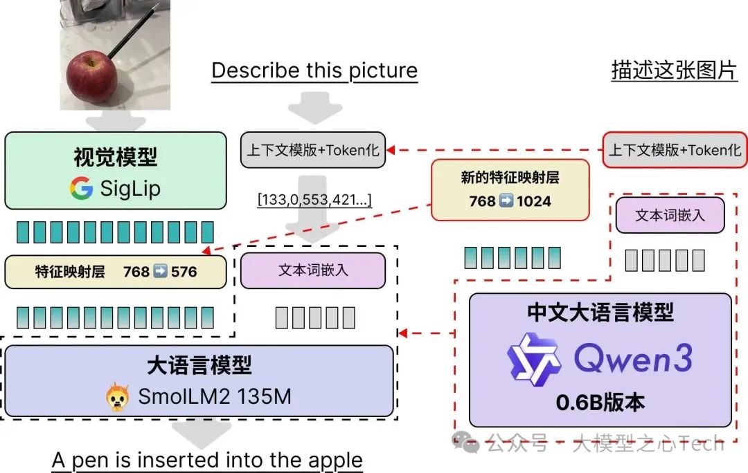 将模型的文本部分直接从SmolLM2换成Qwen3-0.6B,包括其文本tokenizer和词嵌入、文本模型、以及模型最后输出的语言模型头(LM Head)。