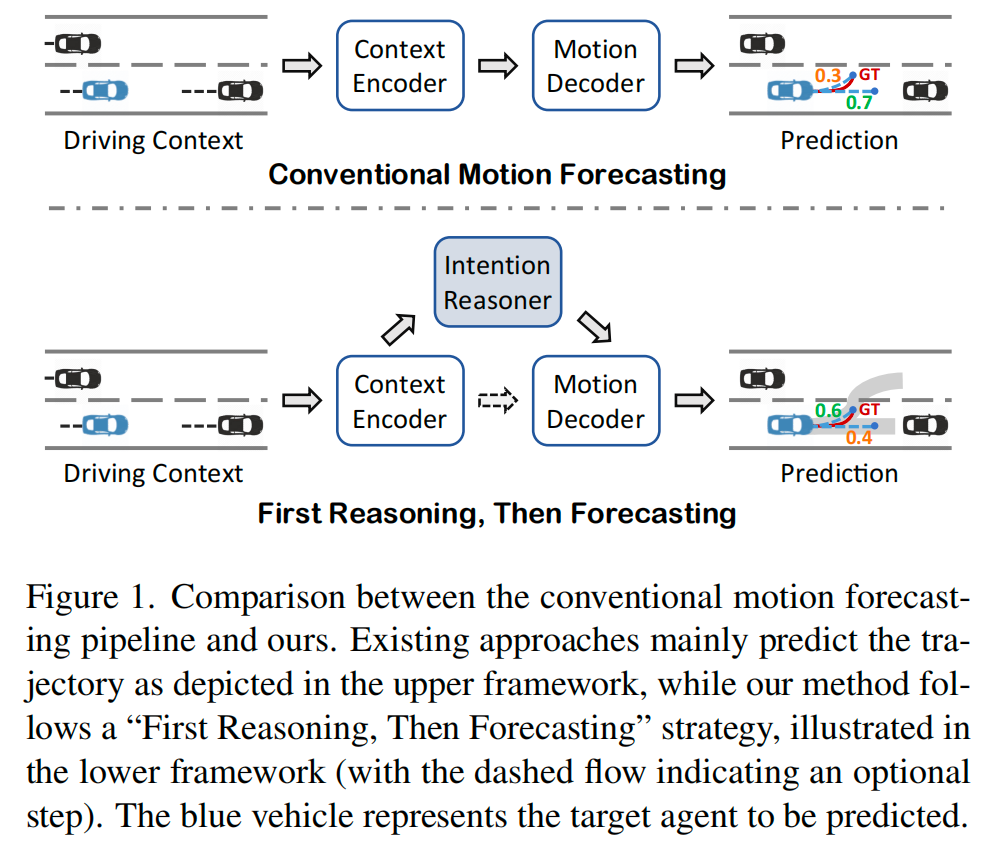 为此,我们提出一种“先推理,后预测(First Reasoning, Then Forecasting)”的策略,其中行为意图推理为准确且可信的多模态运动预测提供了关键的先验指导。以超车场景为例:一个能够提前显式推理出“超车”和“保持车道”两种意图的模型,相比没有进行推理而直接预测的模型,能够生成更可靠的预测结果,如图1所示。