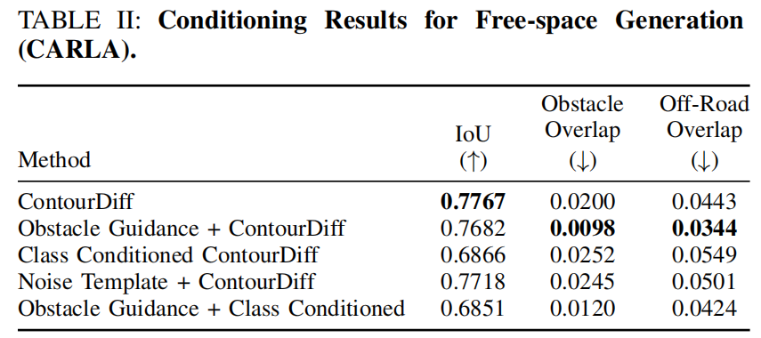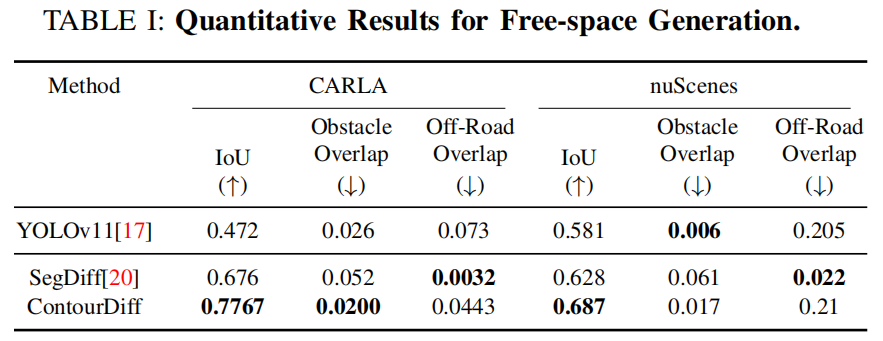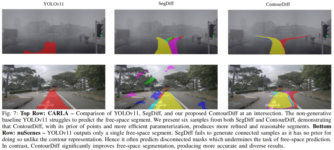 提出 ContourDiff - 一种基于轮廓点去噪的扩散架构,而非标准二进制mask表示,首次实现freespace / 可通行区域的多模态预测,且性能优于生成式和非生成式分割模型。