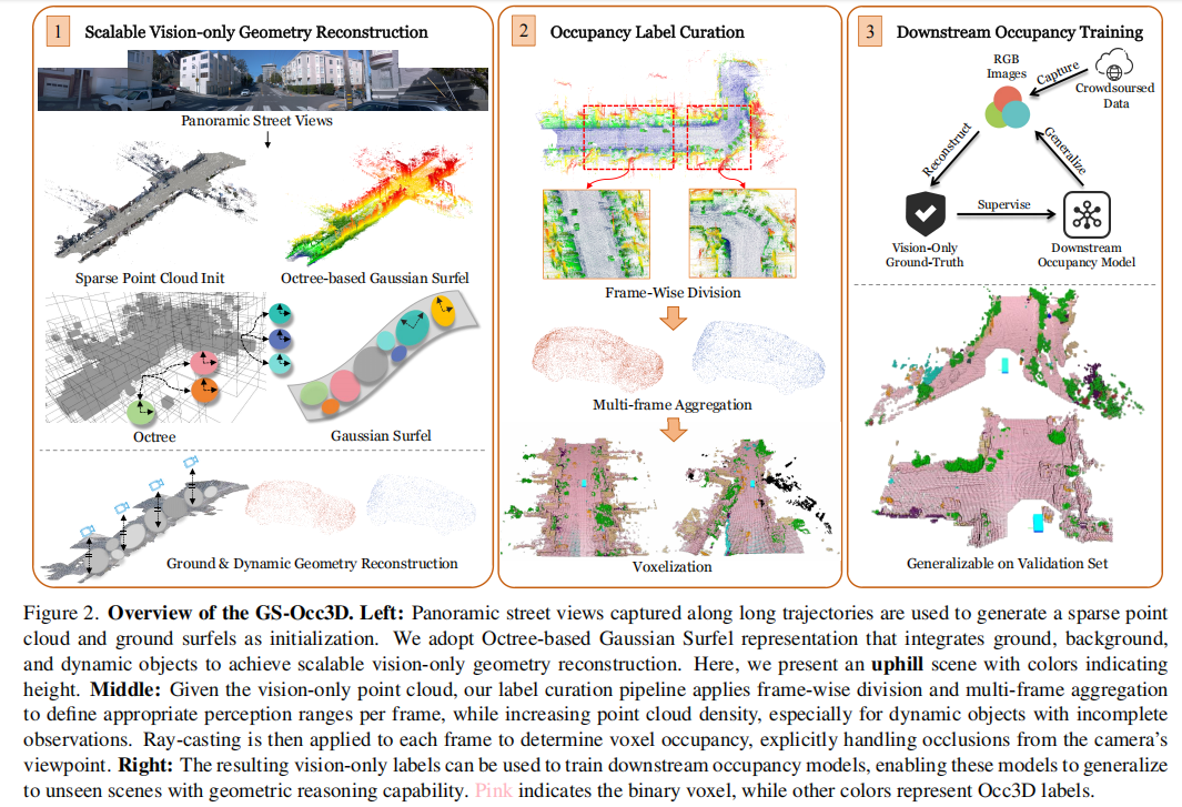 提出了可扩展的纯视觉占用标签生成管道,摆脱对 LiDAR 标注的依赖,支持利用大规模众包数据进行自监督标注,为下游占用感知模型提供支持。