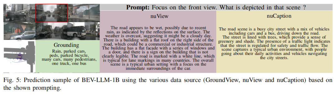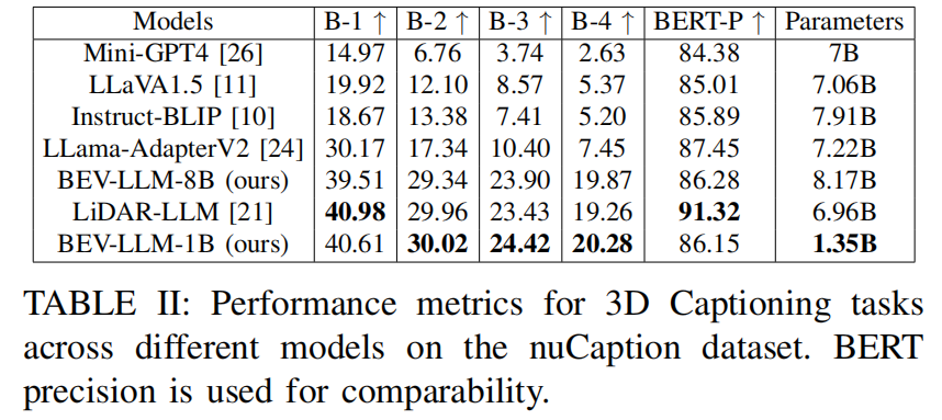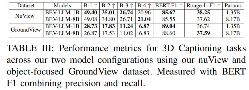 基于轻量级 1B 参数模型的 BEV-LLM 在 nuCaption 数据集上实现竞争性能,BLEU-2、3、4 分数超过现有技术(BLEU-4 达 20.28%);同时发布 nuView(聚焦环境条件与视角)和 GroundView(聚焦目标接地)两个新数据集及基准结果。