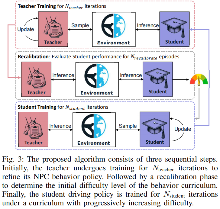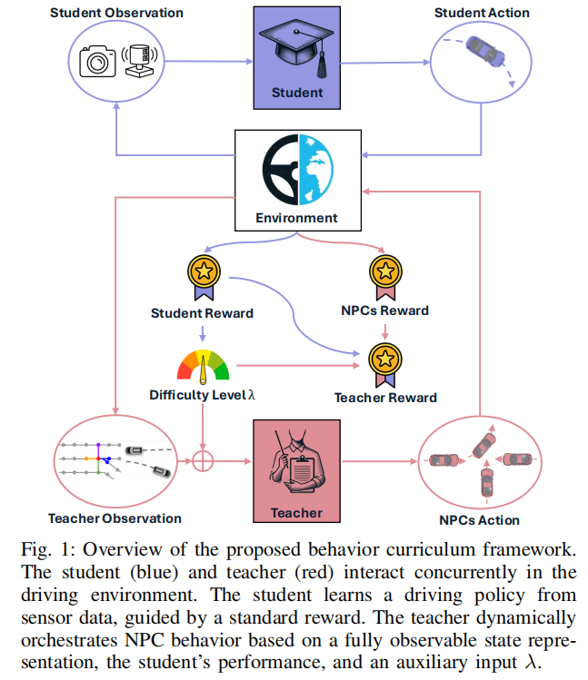 提出一种基于学生 - 教师框架的自动驾驶行为课程学习方法,通过融合多智能体强化学习(MARL)与课程学习,提升自动驾驶智能体对多样化交通行为的泛化性和鲁棒性。