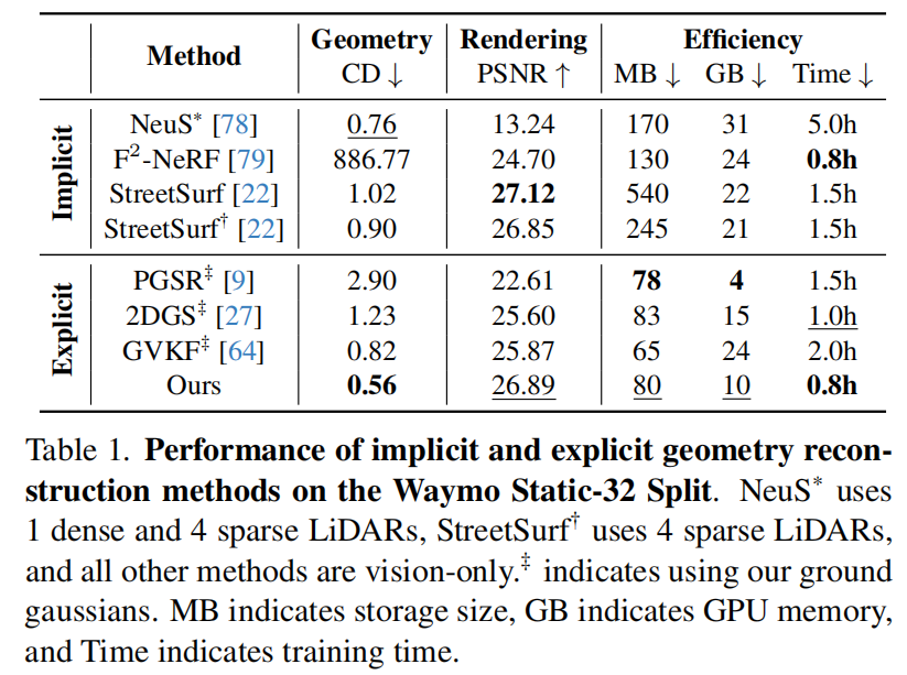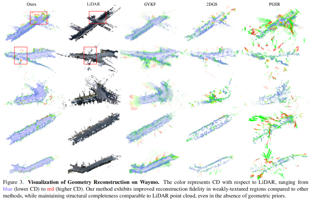 清华大学、奔驰等单位提出GS-Occ3D,首次实现纯视觉的大规模3D占用重建,在Waymo数据集上以0.56倒角距离(CD)刷新几何精度SOTA,训练效率达0.8小时,并实现零样本泛化性能超越激光雷达基线(Occ3D-nuScenes上IoU 33.4 vs. 31.4)。