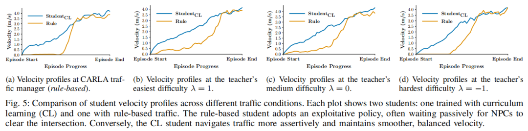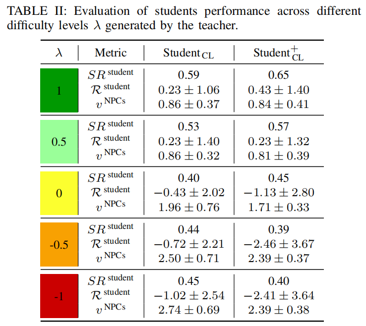 德国信息技术研究中心与卡尔斯鲁厄理工学院IROS 2025中稿的工作,本文提出自适应行为课程框架,通过多智能体强化学习教师动态生成多样化交通行为,使学生智能体在未信号化交叉口场景中的平均速度提升至1.63 m/s(较基线0.82 m/s提升98%),成功率提高至40%(λ=-1最高难度场景)。