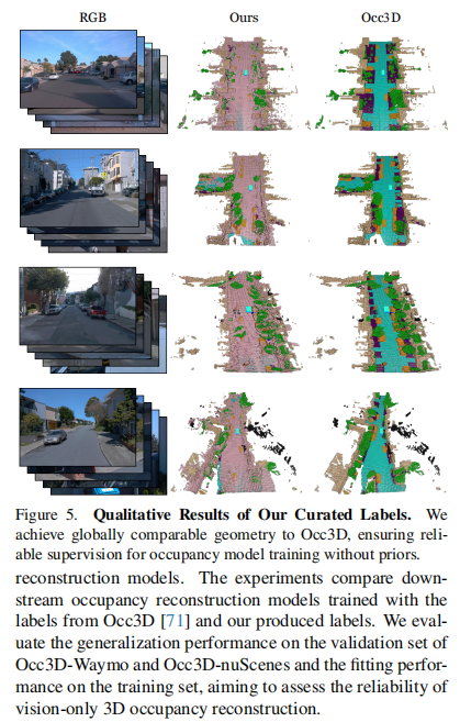 首次采用纯视觉方法重建整个 Waymo 数据集,验证了其生成的标签在 Occ3D-Waymo 下游模型训练中的有效性,并在 Occ3D-nuScenes 上展现出更优的零样本泛化能力,凸显了大规模自动驾驶场景应用的可扩展性。