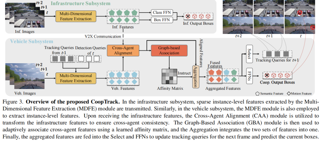 清华大学(AIR研究院)、香港大学、百度联合团队ICCV'25中稿的工作,本文提出端到端协同感知框架CoopTrack,通过可学习实例关联与解码后融合技术,在V2X-Seq数据集实现39.0% mAP与32.8% AMOTA的SOTA性能,传输成本降低至V2X-ViT的2.2%。