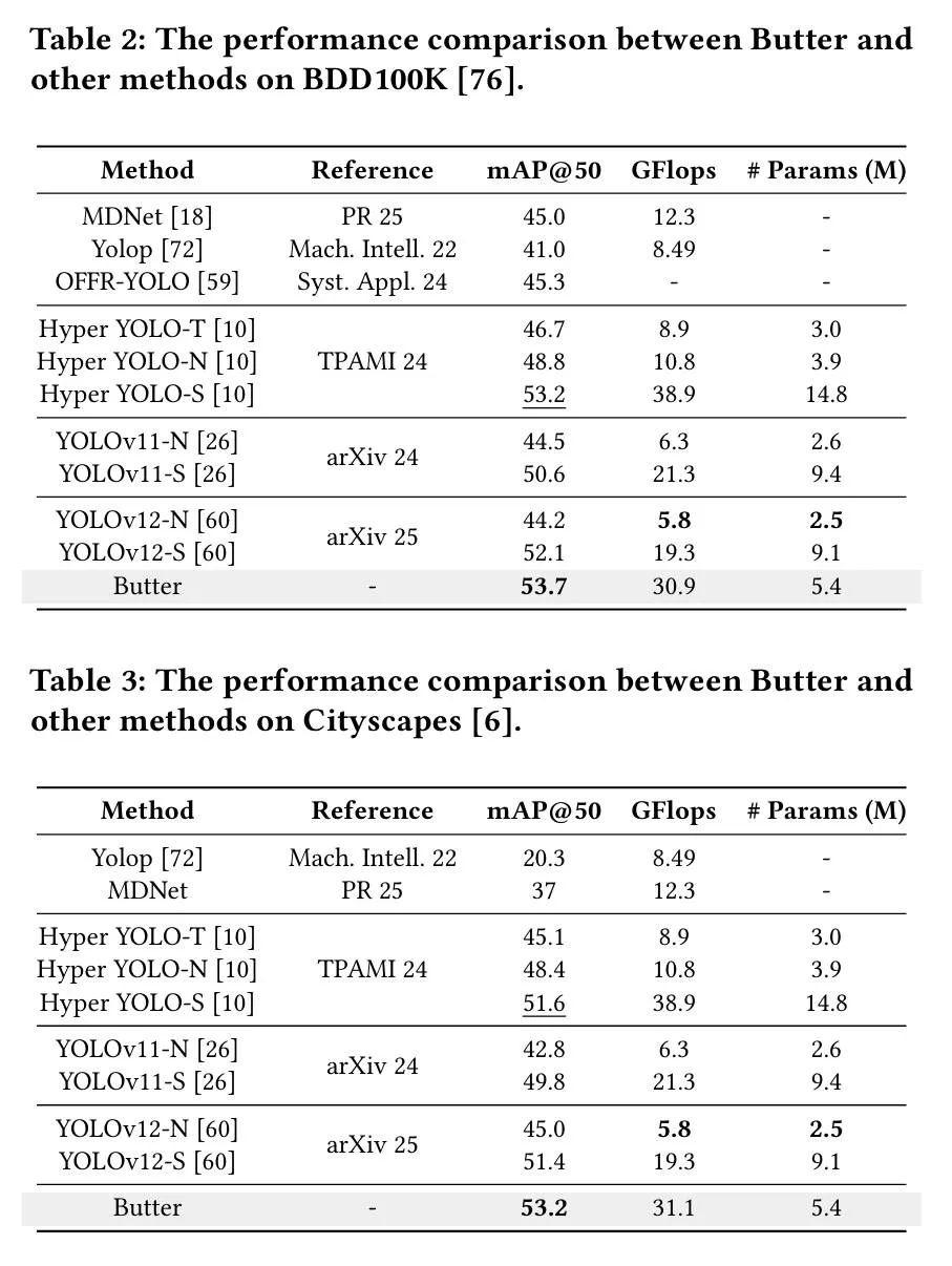 在 BDD100K 和 Cityscapes 数据集上,Butter 分别取得 53.7% 和 53.2% 的 mAP@50,显著优于同为轻量级的 Hyper-YOLO-S 方法,尤其在 Cityscapes 上提升达到 1.6。同时,Butter 模型的 参数量 比 Hyper-YOLO-S 减少了约 64%,显示出更优的 部署适应性。