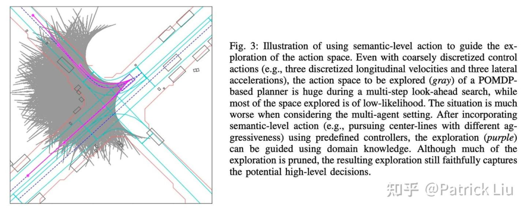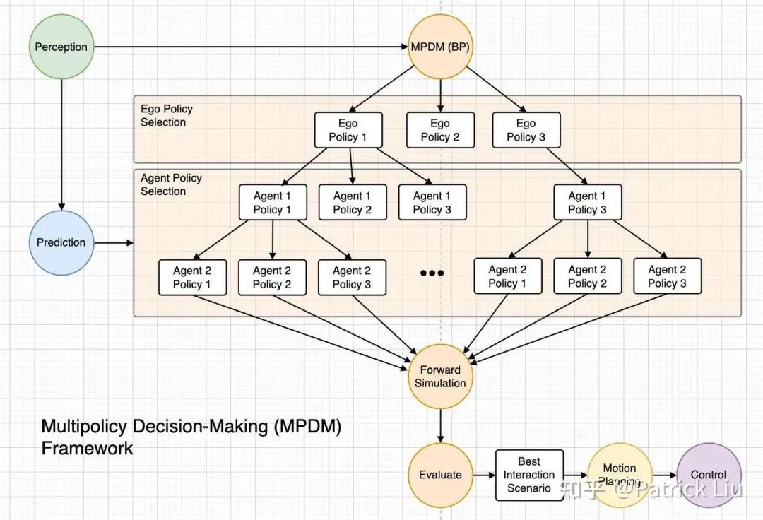 MPDM(Multi-policy Decision Making,及其两项后续的研究,以及白皮书)是这一方向的开创性研究。MPDM通过对有限的离散语义级策略(也就是前文所说的语义动作,semantic actions)集合进行闭环前向模拟,而不是评估每个车辆的每一个可能控制输入,从而简化了POMDP问题。此方法通过专注于少量有意义的语义动作来应对维度诅咒,从而使在自动驾驶场景中进行有效的实时决策成为可能。