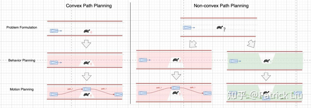 以避障为例,一般来讲这是一个非凸问题。但如果我们知道绕行的方向,那么它就变成了一个凸优化问题,障碍物的位置作为优化问题的下界或上界约束。如果我们不知道绕行的方向,我们需要首先决定绕行的方向,使问题成为运动规划可以解决的凸问题。这个绕行方向的决策就属于行为规划的范畴。