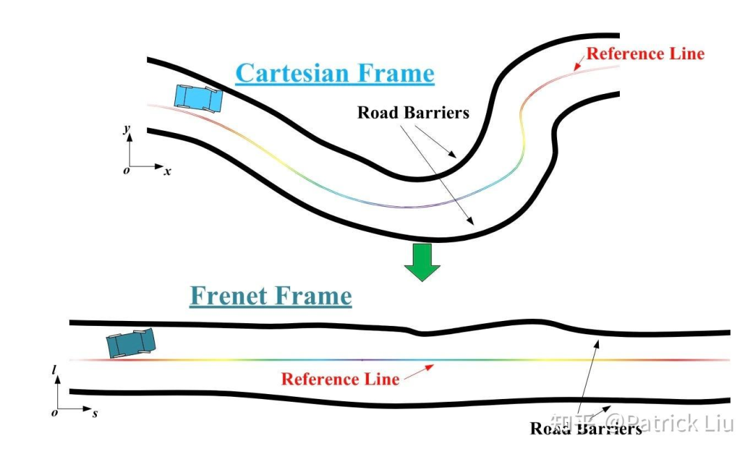 Frenet坐标系:基于参考线的坐标系。Frenet坐标系将笛卡尔坐标系(直角坐标系)中的曲线路径简化为直线隧道模型。详细介绍请见下文。