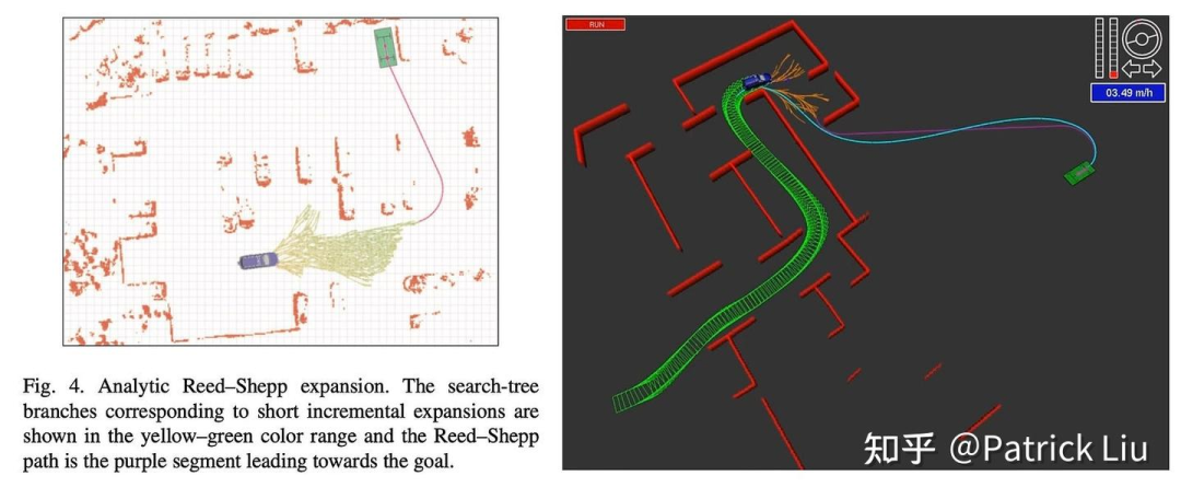 混合A* 的另一个关键创新是解析扩展(analytical expansion, or shot to goal)。对A* 算法的一种较为自然的改进方法是使用一条不碰撞的直线将最近探索的节点连接到目标。如果这是可能的,我们就找到了解。在混合A*中,这条直线被Dubins和Reeds-Shepp(RS)曲线所取代,这些曲线符合车辆的运动学。这种提前停止方法通过更多地关注可行性,在最优性和可行性之间取得了平衡。