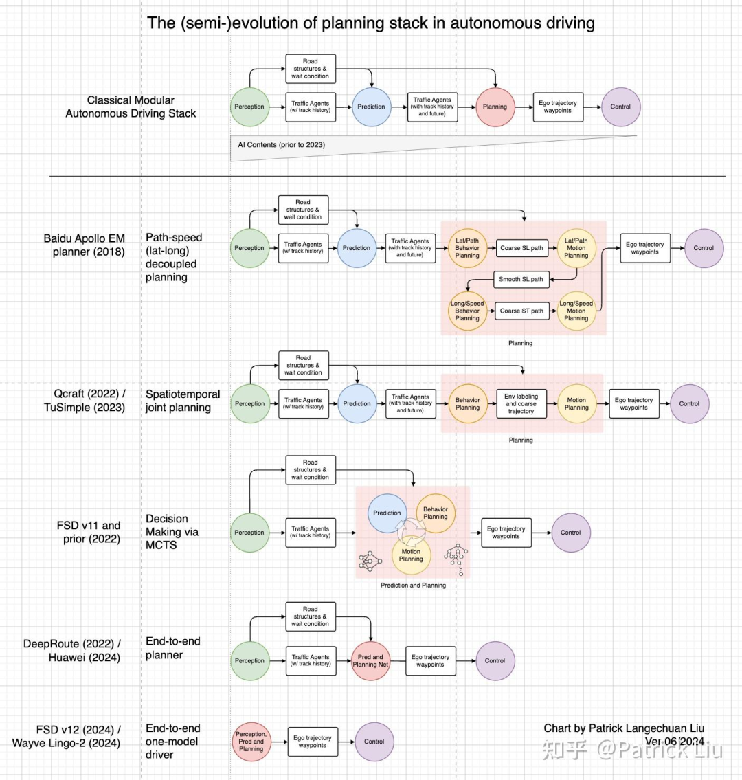 首先,可以看到规划模块的架构变得越来越“端到端“,即更多的模块被整合到一个系统中。我们可以看到模块从路径-速度解耦规划演变为联合时空规划,并从”预测-然后-规划“系统演变为联合预测和规划系统。其次,可以看到规划模块越来越多地采用基于机器学习的组件,特别是在最后三个阶段。这两个趋势趋向于一个端到端的神经网络规划器(不包括感知)甚至是一个端到端的单一模型的神经网络驾驶员(包括感知)。