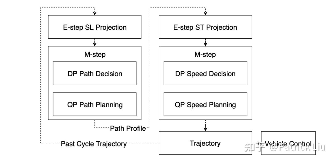 EM规划器通过将三维的纵向-横向-速度问题转化为两个二维问题:纵向-横向问题和纵向-速度问题,大大减少了计算复杂度。Apollo的EM规划器的核心是一个迭代的期望最大化(EM)步骤,包括路径优化和速度优化。每个步骤分为E步(在二维状态空间中的投影和公式化)和M步(在二维状态空间中的优化)。E步涉及将三维问题投影到Frenet SL框架或ST速度跟踪框架。