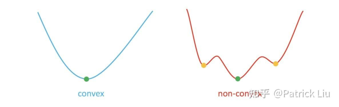 优化可以分为凸优化和非凸优化。关键区别在于,在凸优化场景中,只有一个全局最优解,也就是局部最优解。这一特性使其不受初始解决方案的影响。在非凸优化中,初始解决方案非常重要,如下图所示。