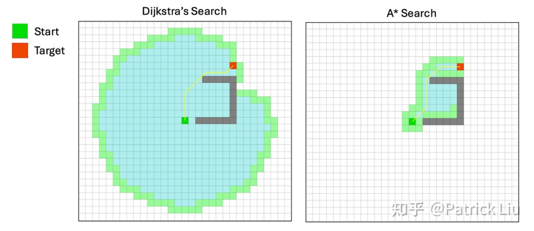 A* 算法使用启发式方法优先考虑看似更接近目标的路径,从而更高效。它结合了到目前为止的成本(Dijkstra算法中原有的成本)和到目标的成本(启发式,本质上是贪婪的最佳优先)。A* 只有在启发式是可接受(admissible)且一致的情况下才能保证最短路径。如果启发式较差,A*的性能可能比Dijkstra基准更差,甚至可能退化为贪婪的最佳优先搜索。