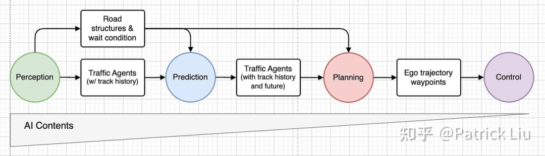 在我们熟知的模块化自动驾驶系统中,通常包含感知、预测、规划和控制等几个部分。截至2023年,机器学习带来的巨大影响主要发生在感知部分,但对下游组件尚没有产生太大的变革。有趣的是,虽然规划栈中AI的渗透率较低,但端到端的感知系统(比如鸟瞰图BEV感知)已经大规模在量产车上得到应用。