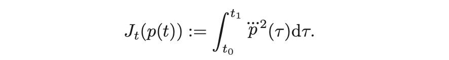 如果我们已经知道给定问题或子问题的解析解,就可以在参数化解空间中进行采样。例如,我们通常希望最小化加加速度(位置p(t)的三阶导数,jerk)的平方时间积分,表示为p上面有三个点(每个点代表一个相对于时间的一阶导数)。这个目标函数(cost)可以表示为: