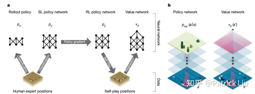 AlphaGo使用了两个神经网络来对MCTS进行增强。价值网络评估给定状态(棋盘配置)的胜率。策略网络评估所有可能动作的动作分布。这些神经网络通过减少搜索树的有效深度和广度来提高MCTS的性能。策略网络有助于动作采样,将搜索集中在有前途的移动上,而价值网络提供更准确的位置评估,减少了大量rollout的需求。这种结合使得AlphaGo能够在围棋的广阔状态空间中进行高效而有效的搜索。