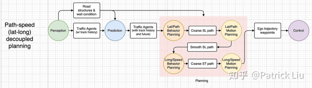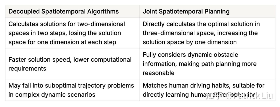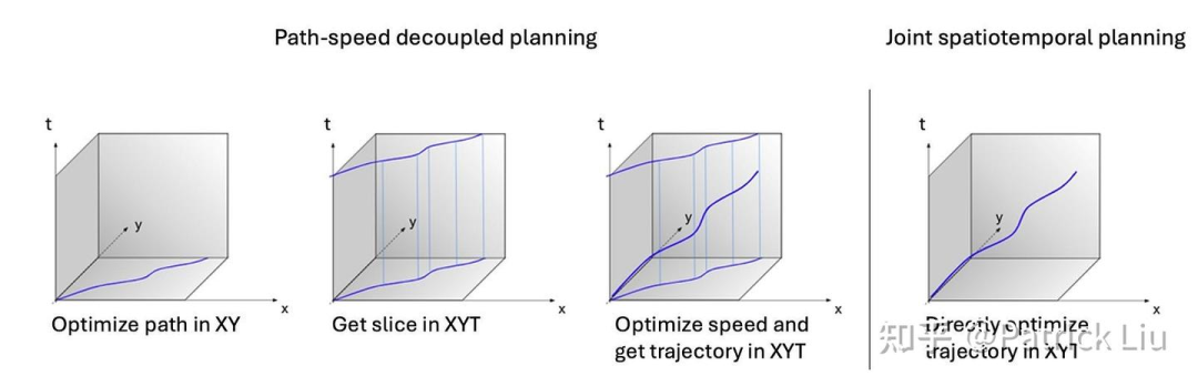 不同规划系统的一个关键区别在于它们是否是时空解耦的。具体来说,时空解耦的方法先在空间维度上规划路径,然后在这条路径上规划速度。这种方法也被称为路径-速度解耦。