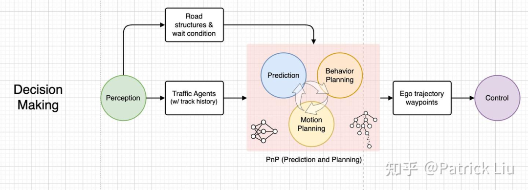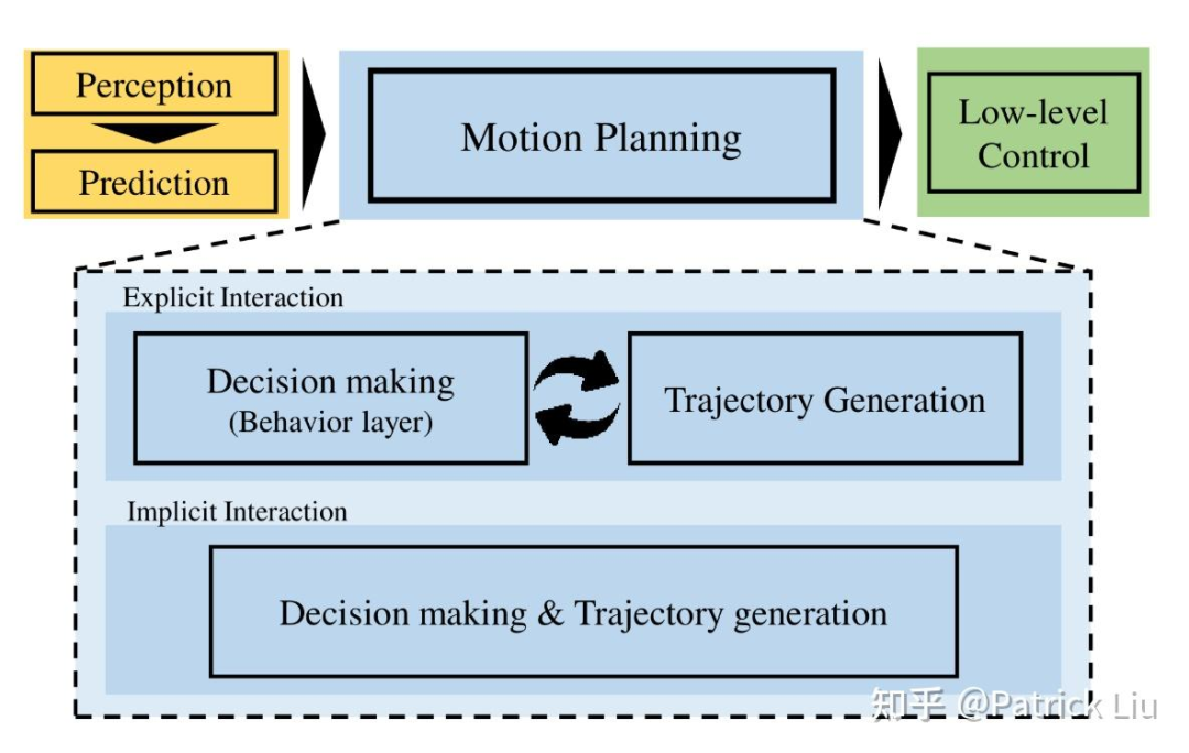 决策(decision making):专注于交互的行为规划。如果没有自车与其他参与者的交互,它仅被称为行为规划,也被称为战术决策。