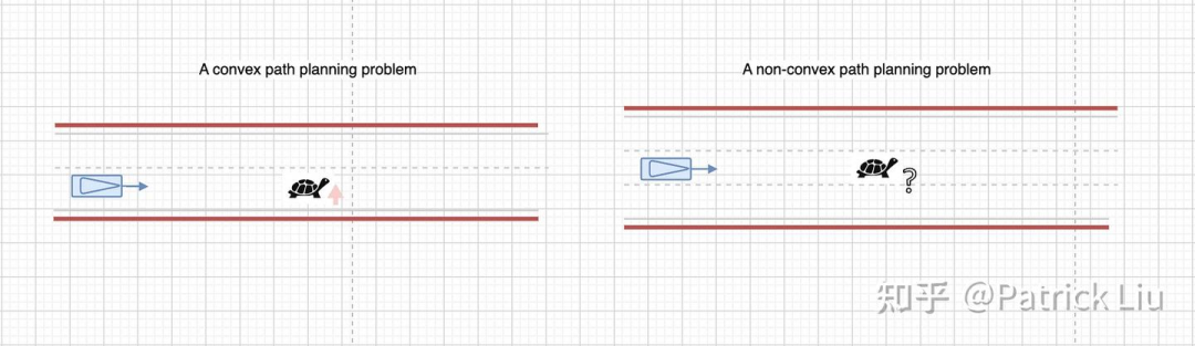 由于规划涉及高度非凸优化,存在许多局部最优解,所以规划很大程度上依赖于初始解决方案。此外,凸优化通常运行得更快,因此在自动驾驶这样的车载实时应用中更受欢迎。一个典型的方法是将凸优化与其他方法结合使用,首先勾勒出一个凸解空间,在进行凸优化。这其实就是把行为规划和运动规划进行分离的数学基础:行为规划来负责找到一个好的初始解决方案,运动规划再进行精细的凸优化。