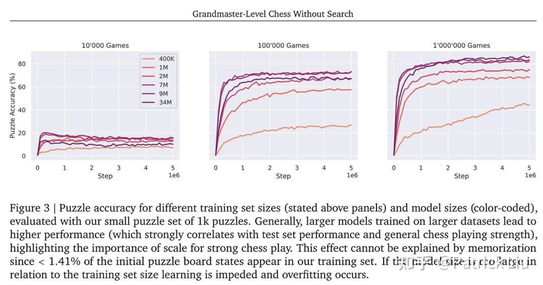 最近的论文探索了这种快速系统在神经网络方面的上限。"无需搜索的象棋"论文展示了在有足够数据(来源于传统算法的树搜索)的情况下,有可能达到大师级的水平。存在一个明确的scaling law与数据量和模型规模相关,表明随着数据量和模型复杂性的增加,系统的熟练度也会提高。
