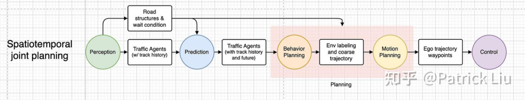 一个传统的规划模块大致包括全局路径规划(route planning)、行为规划(behavior planning)和轨迹规划(trajectory planning)。全局路径规划提供从起点到终点在全局地图上的道路级路径。行为规划决定未来几秒内的语义动作类型(例如跟车、绕行、侧向通过、礼让和超车等)。根据行为规划模块给出的行为类型,轨迹规划生成短期的行驶轨迹。全局路径规划通常在设置导航后由地图服务提供,不在本文讨论范围内。我们在本文中将重点放在行为规划和轨迹规划上。