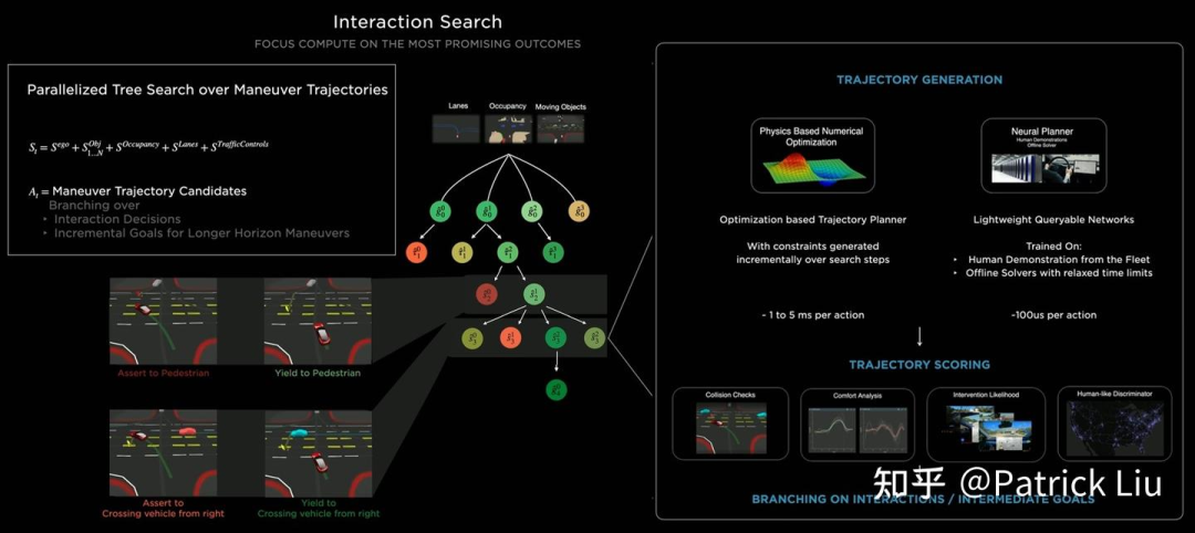 轨迹评分通过结合传统的基于物理的检查(如碰撞检查和舒适度分析)与神经网络评估器来进行。特斯拉使用了两个神经网络评估器,一个预测接管(takeover)可能性另一个预测和人类的相似度。这种评分有助于修剪搜索空间,将计算集中在最有前途的结果上。