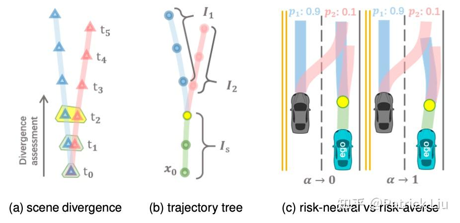 应急规划的一个重要方面是延迟决策分叉点。也就是说,延迟不同潜在轨迹分离的时间点,让自车有更多时间收集信息并对不同的结果做出反应。通过这样做,车辆可以做出更明智的决策,从而实现更平稳和更有信心的驾驶行为,类似于有经验的司机。