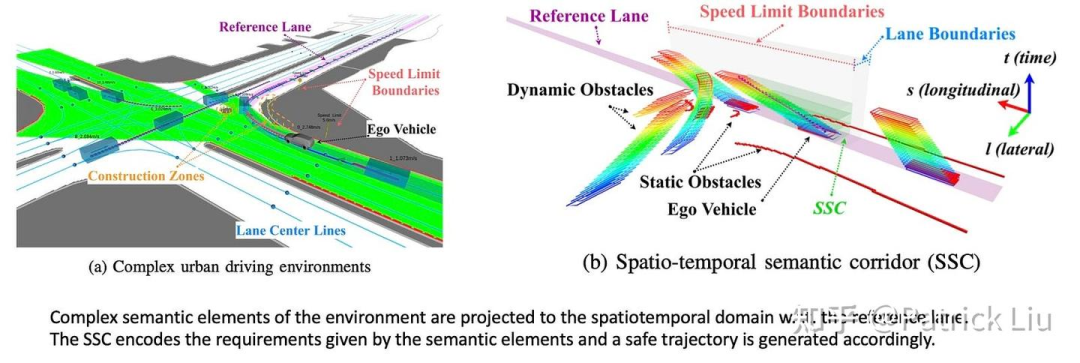 另一种方法是构建时空走廊,本质上是一条在三维时空状态空间(例如SLT)中带有车辆足迹的曲线。时空语义走廊(SSC,2019年RAL)将语义元素的要求编码为语义走廊,生成相应的安全轨迹。语义走廊由一系列相互连接的无碰撞立方体组成,由时空域中的语义元素提出的动态约束。在每个立方体内,它成为一个可以使用二次规划(QP)解决的凸优化问题。