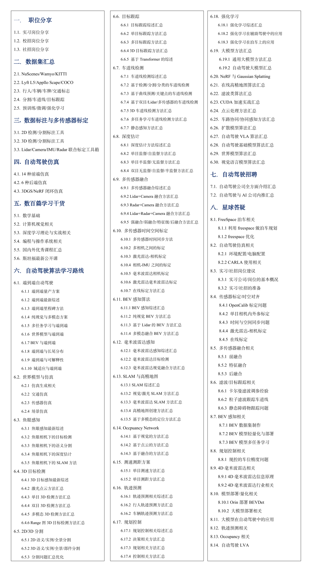 我们为大家汇总了近40+开源项目、近60+自动驾驶相关数据集、行业主流自驾仿真平台、以及各类技术学习路线,包括但不限于: