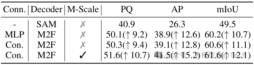 分割器架构的影响:采用 Mask2Former 解码器比 SAM 原生解码器的 PQ 提升 9.2,加入卷积连接器和多尺度特征后,PQ 再提升 1.3,证明精细的特征处理对分割精度的关键作用。