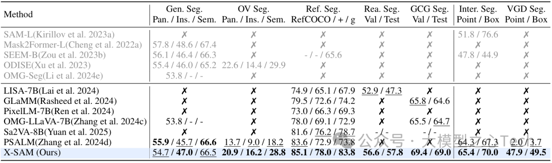 研究团队在 7 大核心任务、20 多个数据集上对 X-SAM 进行了全面测试,结果显示它在所有任务中均达到或超越当前最佳水平: