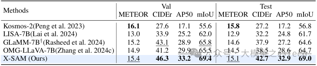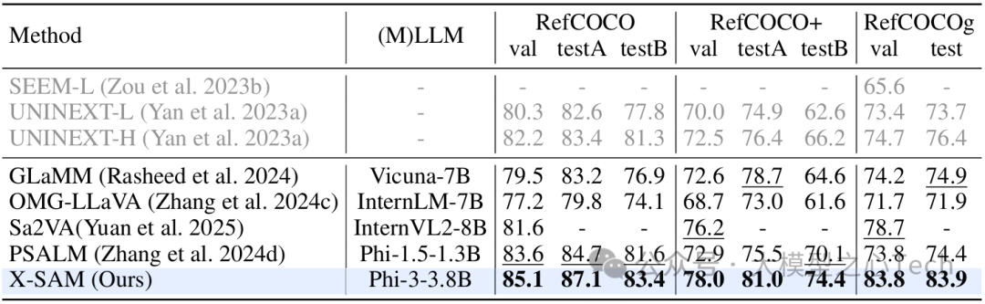 Referring 分割:在 RefCOCO、RefCOCO+、RefCOCOg 三大数据集上,X-SAM 的 cIoU(修正交并比)分别为 85.1、78.0、83.8,大幅领先 PSALM(83.6、72.9、73.8)和 Sa2VA(81.6、76.2、78.7),即使模型参数更小(3.8B vs 8B),仍能实现反超。